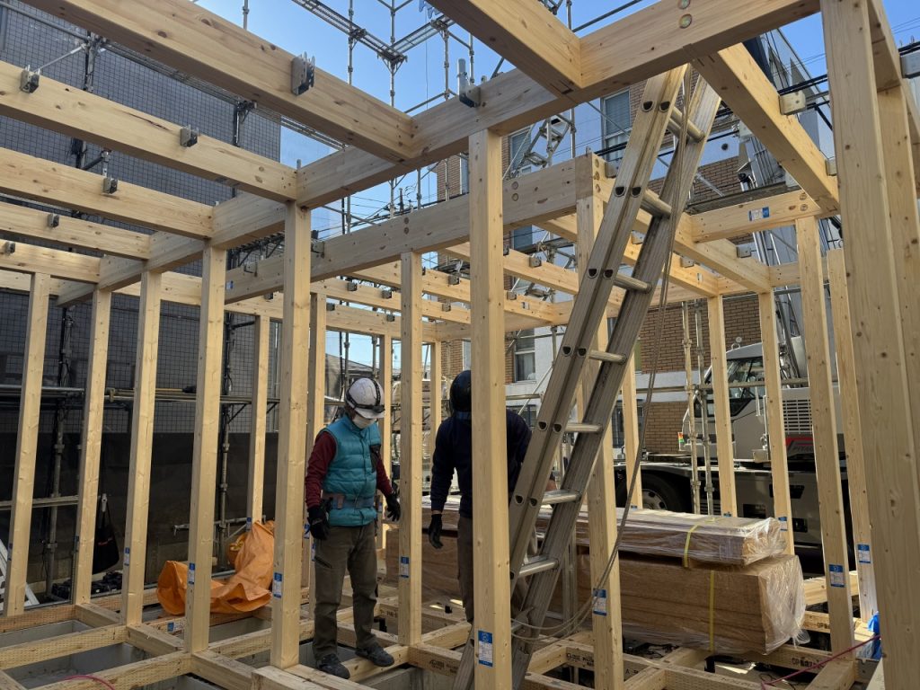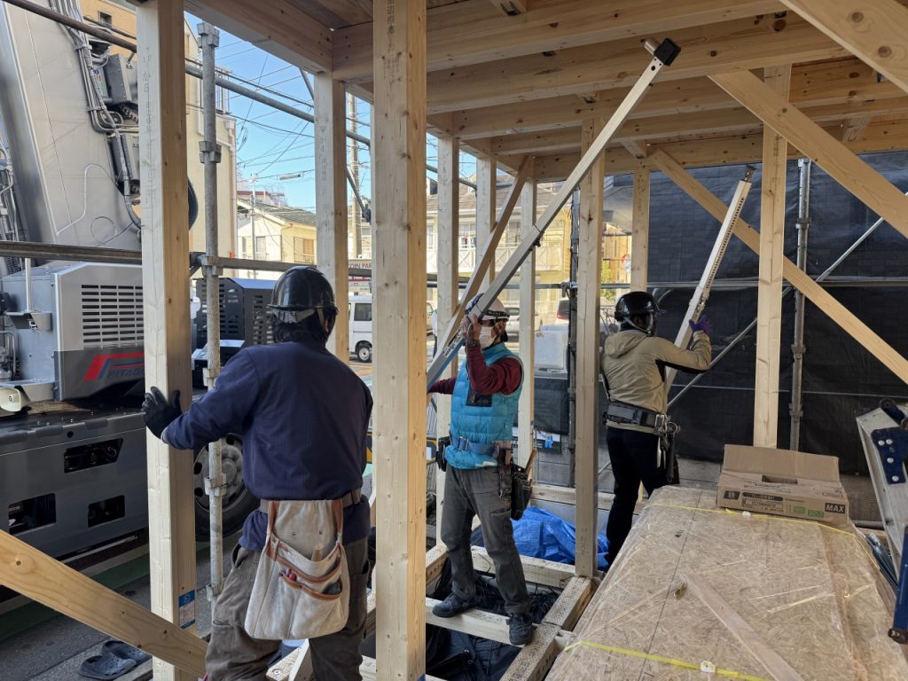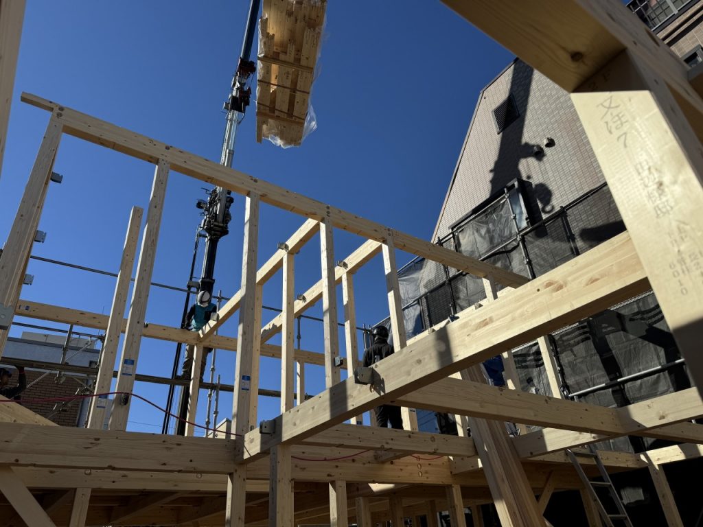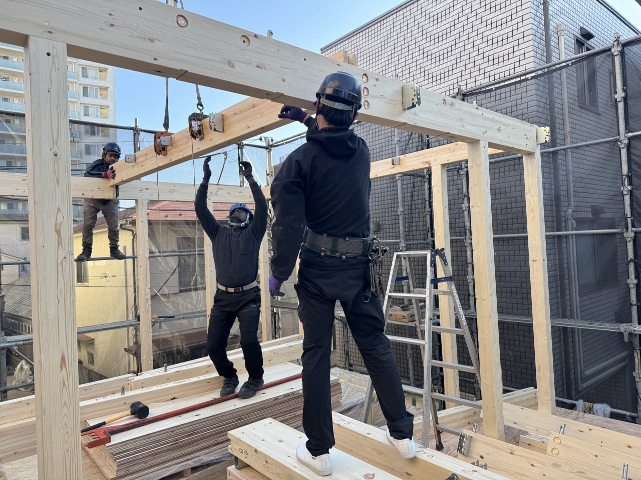 絶妙なチームワークで上棟が完了しました。