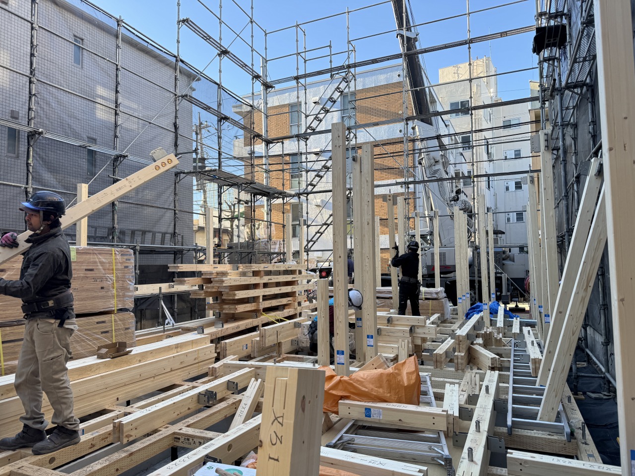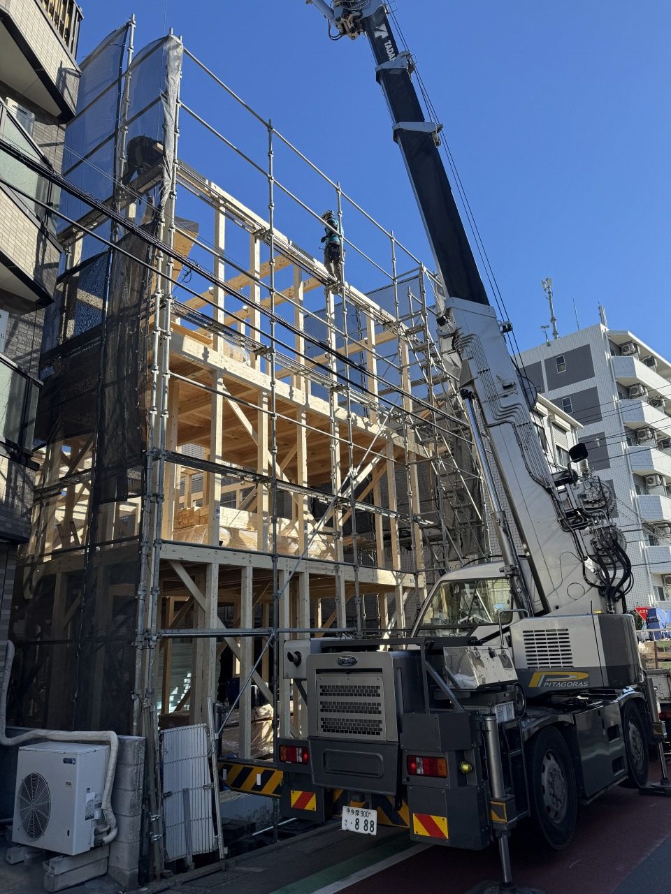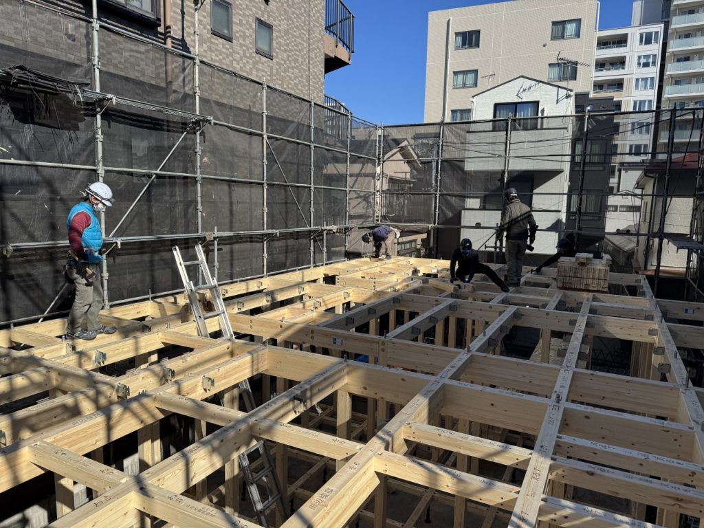 絶妙なチームワークで上棟が完了しました。