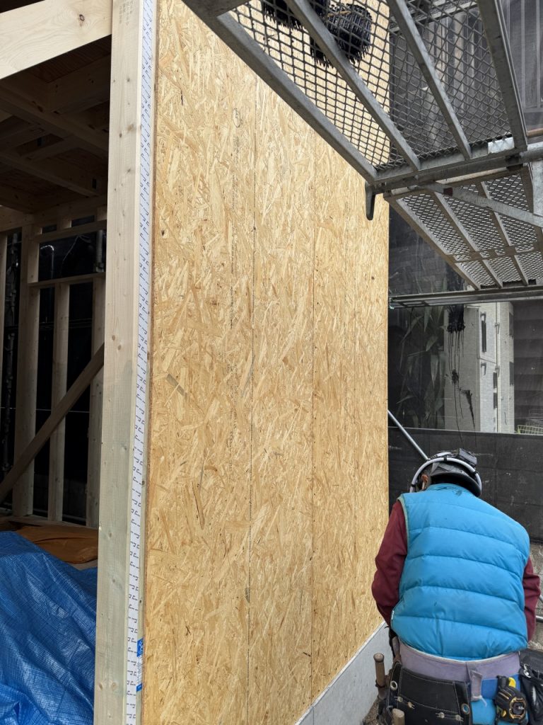 ↓制震テープが貼られた上に「構造用合板」を施工します。