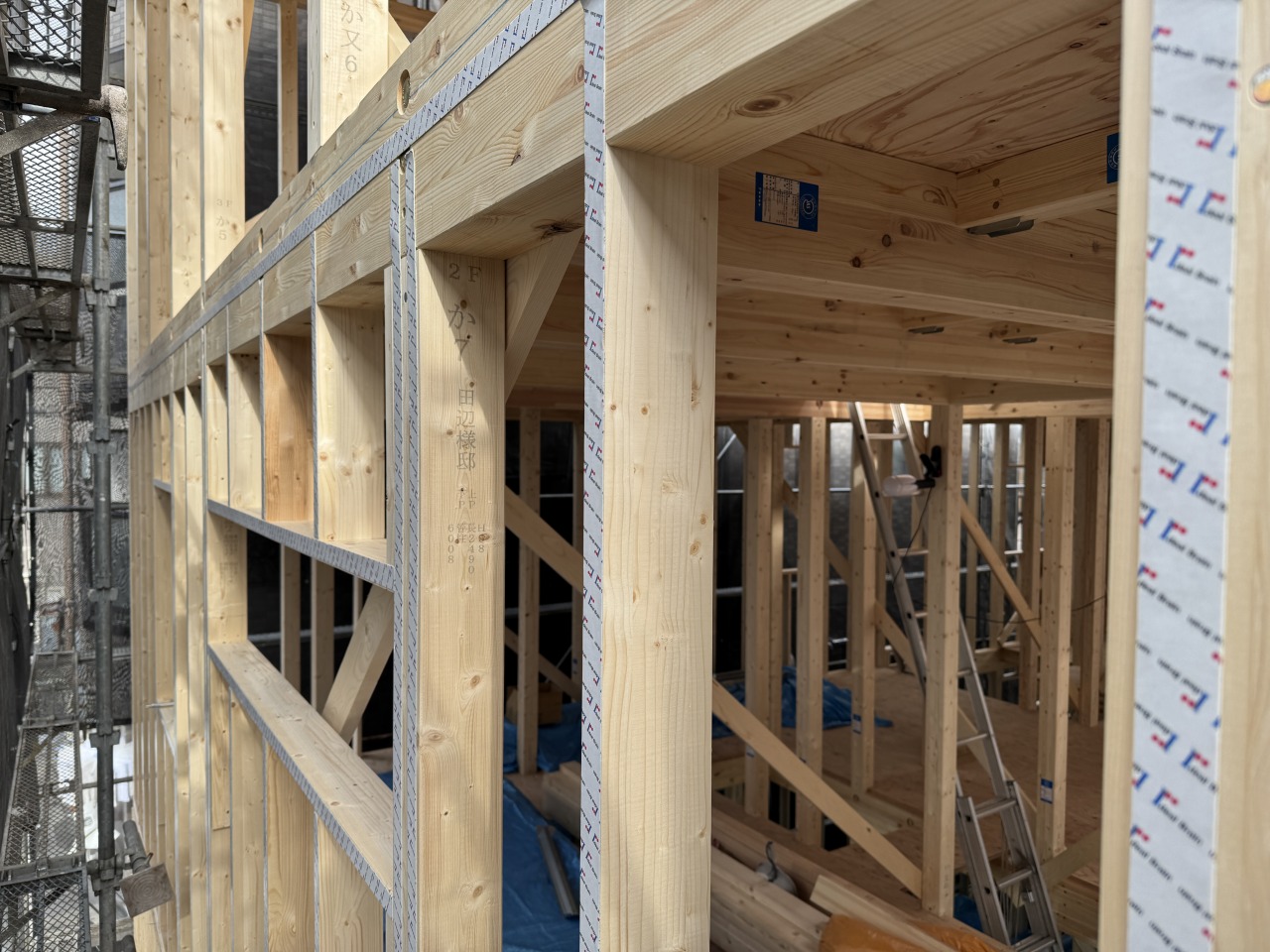 ↓柱などに貼られたテープ状のものが「制震テープ」となります。