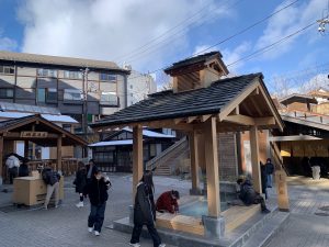 個人的にびっくりしたのは、捨てる源泉の湯を道路下に配管で流し、融雪するシステムです。湯畑中心に比較的大きな道路は雪が積もっていないのでびっくり!